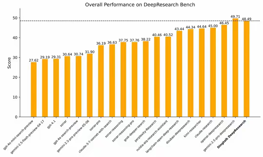 11月12日,国际权威评测DeepResearch Bench最新公布了最新测试结果:一项由中国科技企业研发的深度研究系统“Dingtalk-DeepResearch” 以48.49位列全球第二,仅次于获得49.71分的gemini-2.5-pro-DeepResearch,同时,OpenAI、Claude分列全球第三四位。这也标志着中国企业级AI技术迈入国际第一梯队。
