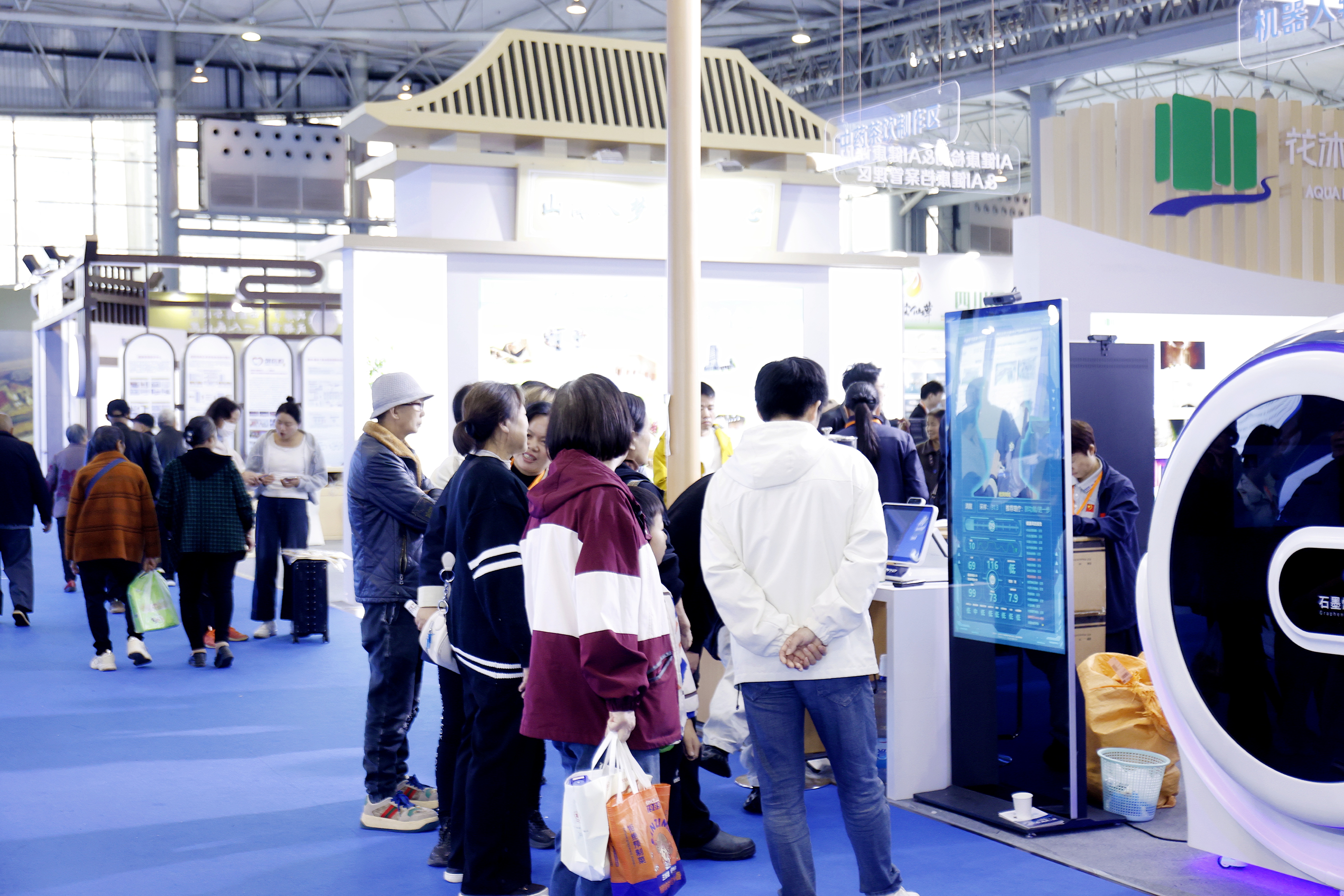 “养”“游”“食” 展区:融合场景引领健康生活。在 “养” 展区,哈工天愈的高科技康养机器人围满了体验观众,一位退休老人体验后赞叹:“这个机器人能精准按摩康复,在家就能享受专业护理,太方便了!”;“游”展区的花沐里温泉大健康城打造“医疗+文旅”新场景,将健康检测、康养理疗与温泉度假有机结合,为健康旅游产业发展提供了创新范式;“食” 展区内,内江天冬、古蔺赶黄草等道地食药同源产品深受青睐,观众在试吃体验中感受“药食同源”的养生智慧,现场达成多项采购意向,推动了地方特色健康产业的市场化发展。